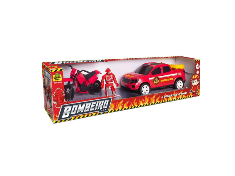 A linha bombeiro vem com uma moto, uma pickup e um bombeiro prontos para o resgate. A moto possui suspensão traseira para tornar ainda mais real a brincadeira. A pickup vem com um super bote.