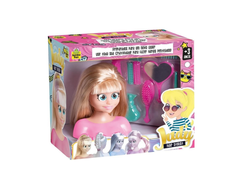 Boneca Judy - Busto com acessórios de salão de beleza, para você se divertir e criar diversos penteados na sua nova amiguinha. Acessórios que acompanham: secador, espelho, bobs para cabelo, escova, batom, borrifador de água e uma tiara. Além de estimular a coordenação motora, estimula também a criatividade e a interação entre pais e filhos.