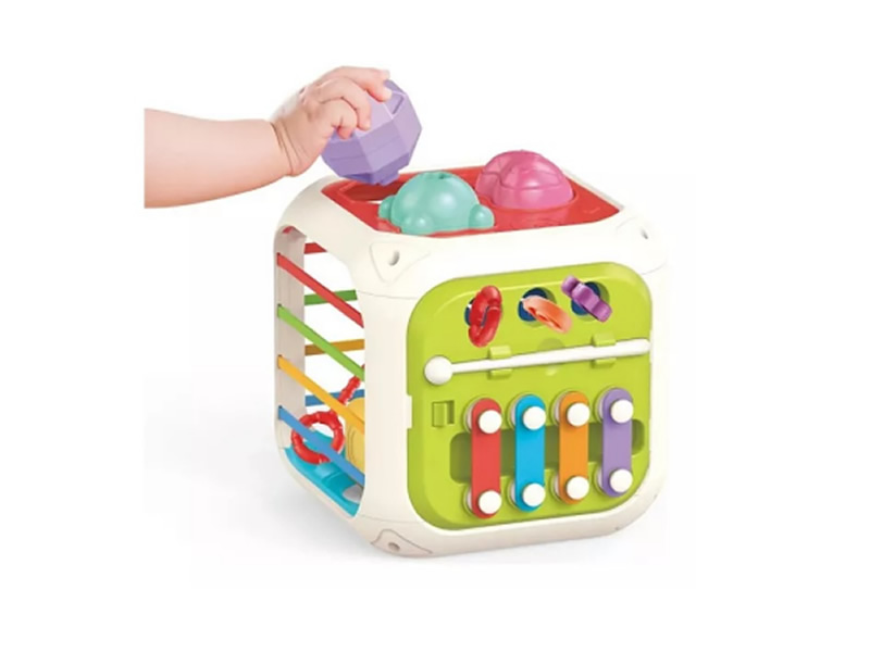 - cubo educativo 7 em 1; - jogo de acertar os blocos nos respectivos espaços; - blocos-chocalho empilháveis; - cordas elásticas para segurar os blocos dentro do cubo; - xilofone com 4 teclas coloridas; - engrenagens giram e anéis deslizam.