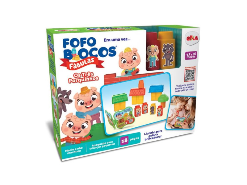 O Fofoblocos é uma linha de blocos de montar macios e fofinhos para seu pequenos. E nessa versão Fábulas, Os três Porquinhos ganham vida com brincadeira de contar história, montar e se divertir! O lobo derrubou a casinha? É Só montar e começar tudo de novo!