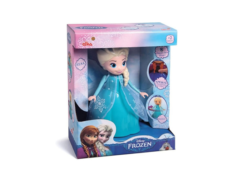 Anna e a Elsa são irmãs que contemplam o amor verdadeiro. Vivem no reino de Arendelle, Elsa tem poderes mágicos que transformam gelo em magia e Anna está sempre junto de sua irmã para ajudá-la. Imagine brincar com Elsa e Anna. Apertando sua barriguinha, a boneca fala 8 frases iguais as do filme. Tem bolinha no vestido para a boneca deslizar ou girar.