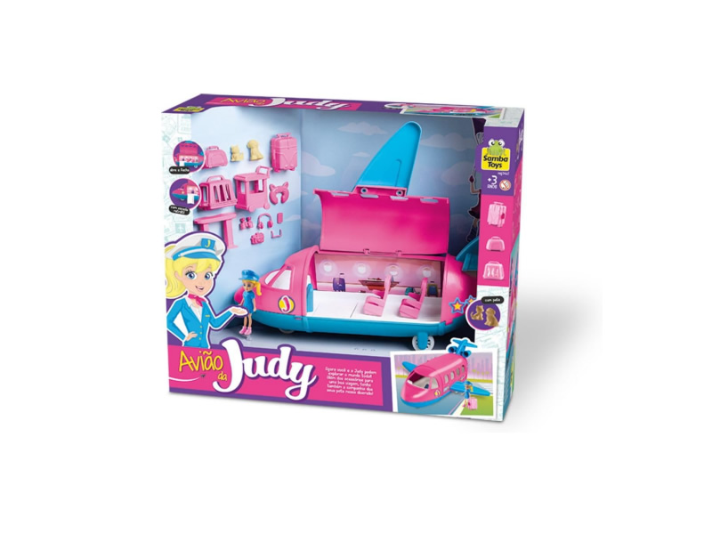 Com escada retrátil e porta basculante, o Avião da Judy vem repleto de acessórios como, fone de ouvido, câmera fotográfica, óculos de sol, celular, mala, binoculo e muitos mais. Com o Avião da Judy agora você e a Judy podem explorar o mundo todo! Além dos acessórios para uma boa viagem, tenha também a companhia de seus pets nessa diversão!